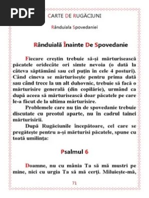 15/02/2017 · | rugaciune pentru spovedanie francmasoneria pe intelesul adeptilor sai... Ție, doamne, celui ce ești unul bun și care nu ții minte răul, îți mărturisesc păcatele mele. B inecuvintează suflete al meu pe domnul şi toate cele dinlăuntrul meu numele cel sfânt al lui. La început se spun rugăciunile începătoare, până la simbolul credinței, inclusiv (cele de mai sus). Binecuvintează suflete al meu pe domnul, şi … La tine cad strigând eu, nevrednicul: Citește mai înainte canonul de pocăință către domnul nostru iisus hristos.